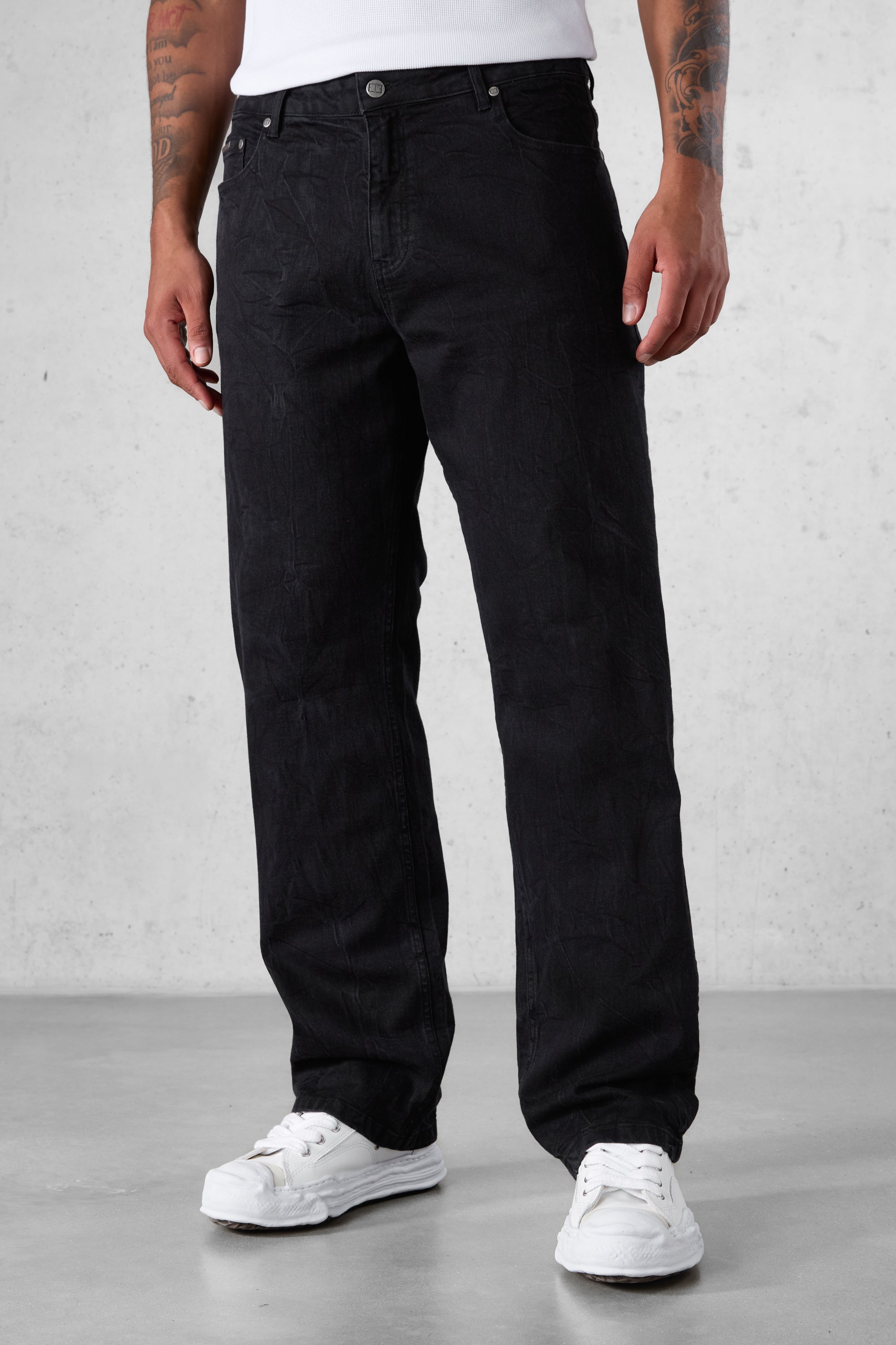 • WASHED BLACK WRINKLED STRAIGHT JEANS